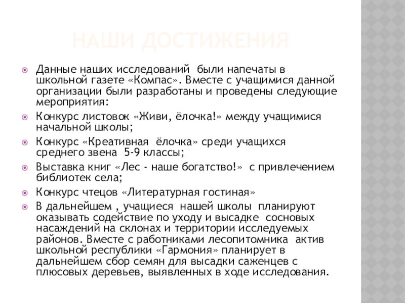 В дальнейшем , учащиеся нашей школы планируют оказывать содействие по уходу и высадке сосновых насаждений на склонах и территории исследуемых районов. Вместе с работниками лесопитомника актив школьной республики «Гармония» планирует в дальнейшем сбор семян для высадки саженцев с плюсовых деревьев, выявленных в ходе исследования.