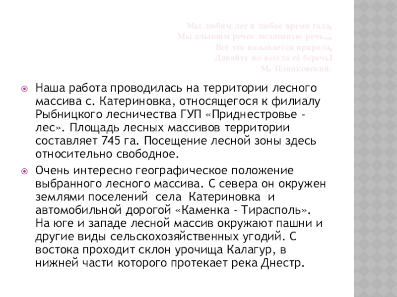 Наша работа проводилась на территории лесного массива с. Катериновка, относящегося к филиалу Рыбницкого лесничества ГУП «Приднестровье - лес». Площадь лесных массивов территории составляет 745 га. Посещение лесной зоны здесь относительно свободное.