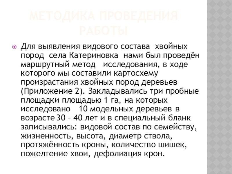 был проведён маршрутный метод исследования, в ходе которого мы составили картосхему произрастания хвойных пород деревьев (Приложение 2). Закладывались три пробные площадки площадью 1 га, на которых исследовано 10 модельных деревьев в возрасте 30 – 40 лет и в специальный бланк записывались: видовой состав по семейству, жизненность, высота, диаметр ствола, протяжённость кроны, количество шишек, пожелтение хвои, дефолиация крон.