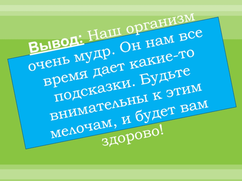Слайд 35Вывод: Наш организм очень мудр. Он нам все время дает какие-то