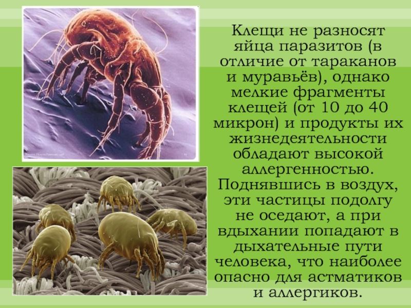 однако мелкие фрагменты клещей (от 10 до 40 микрон) и продукты их жизнедеятельности обладают высокой аллергенностью.