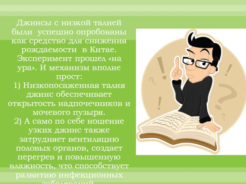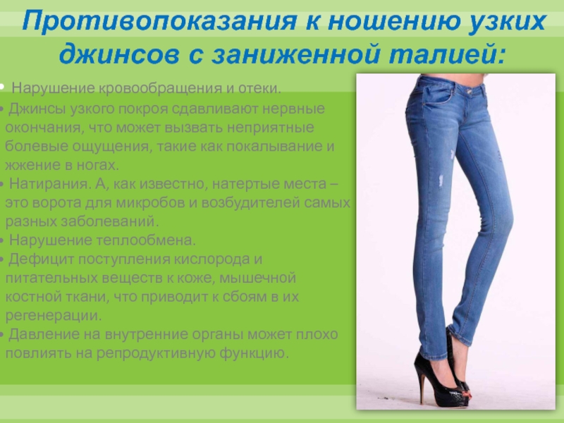 2) А само по себе ношение узких джинс также затрудняет вентиляцию половых органов, создает перегрев и повышенную влажность, что способствует развитию инфекционных заболеваний.