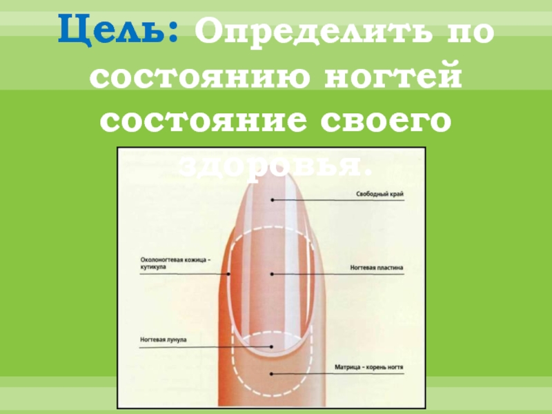 Слайд 28Цель: Определить по состоянию ногтей состояние своего здоровья.