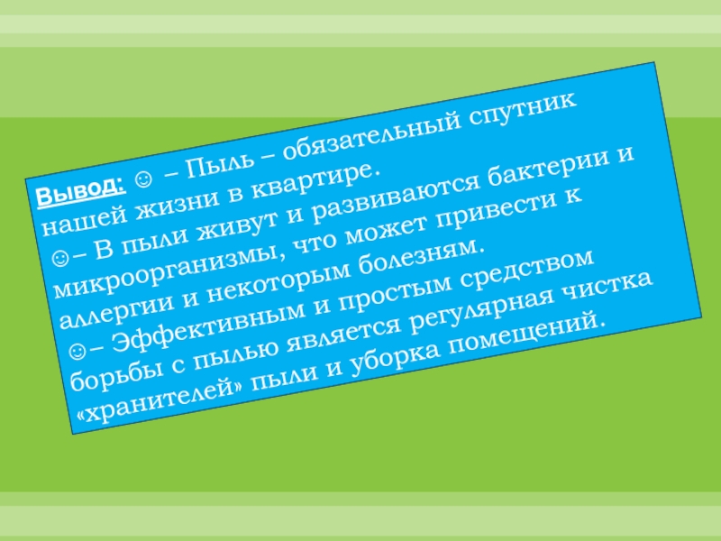 Слайд 47Вывод: – Пыль – обязательный спутник нашей жизни в квартире.