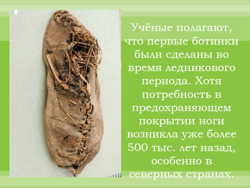 Слайд 11Учёные полагают, что первые ботинки были сделаны во время ледникового периода.