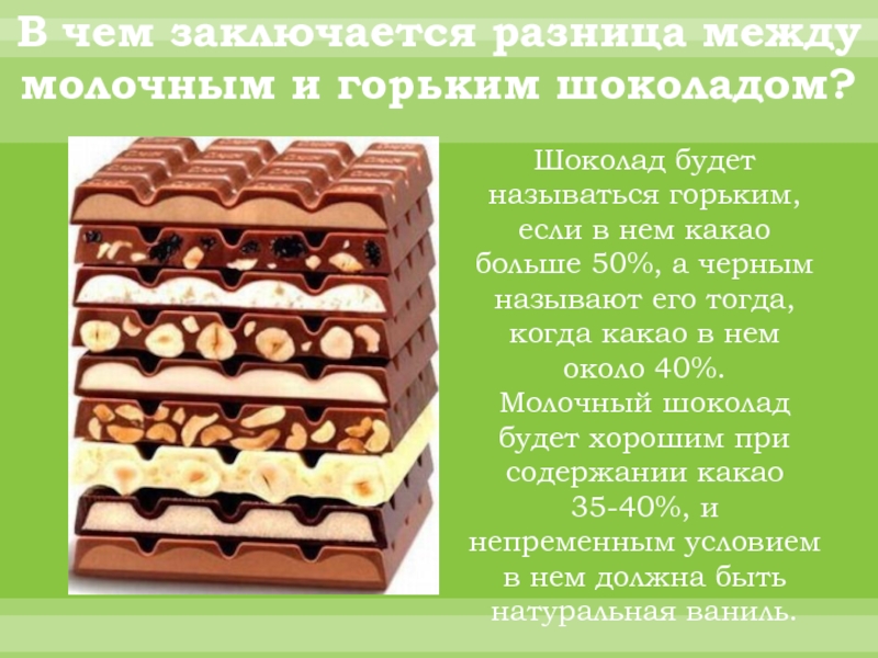 Слайд 24В чем заключается разница между молочным и горьким шоколадом?