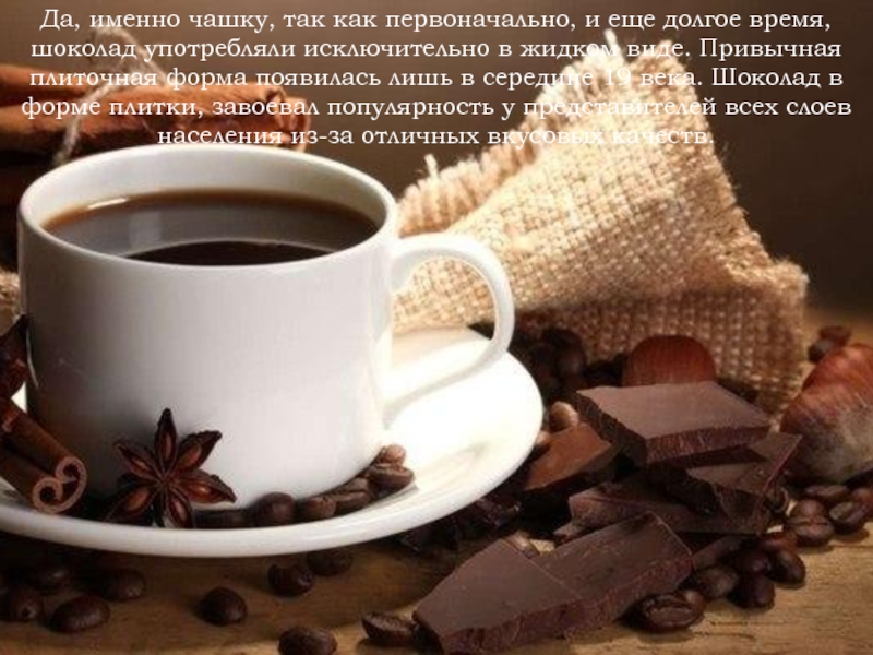Слайд 20Да, именно чашку, так как первоначально, и еще долгое время, шоколад