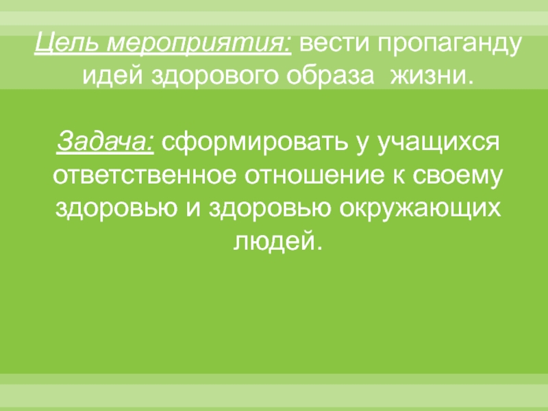Слайд 2Цель мероприятия: вести пропаганду идей здорового образа жизни.