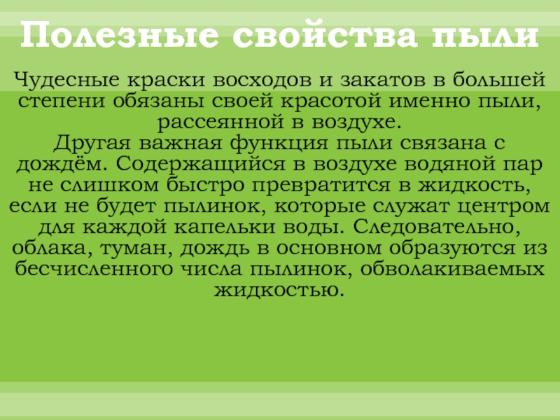 Другая важная функция пыли связана с дождём. Содержащийся в воздухе водяной пар не слишком быстро превратится в жидкость, если не будет пылинок, которые служат центром для каждой капельки воды. Следовательно, облака, туман, дождь в основном образуются из бесчисленного числа пылинок, обволакиваемых жидкостью.