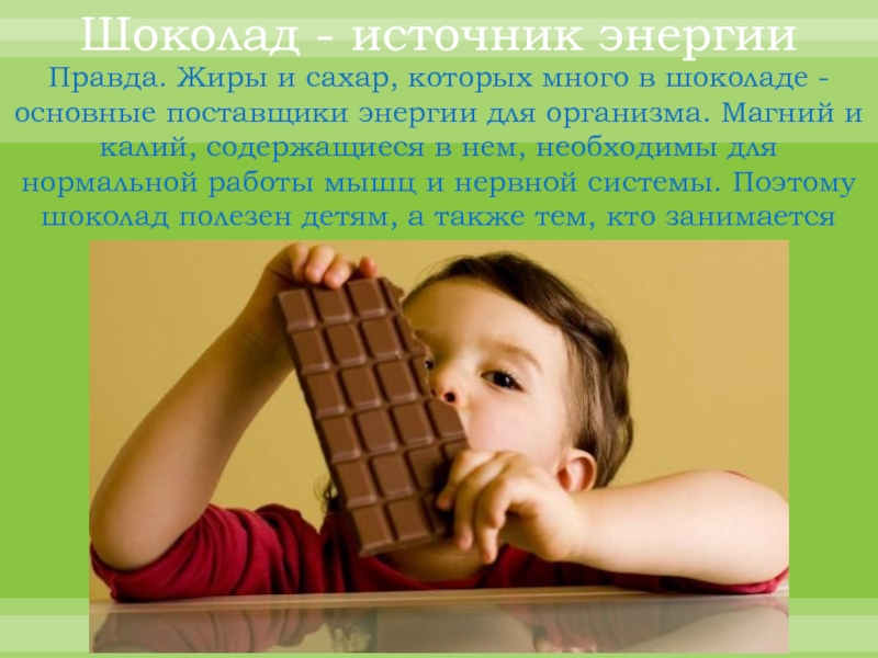 шоколаде - основные поставщики энергии для организма. Магний и калий, содержащиеся в нем, необходимы для нормальной работы мышц и нервной системы. Поэтому шоколад полезен детям, а также тем, кто занимается спортом.