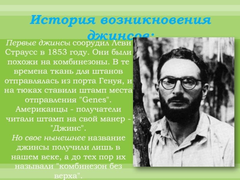 Они были похожи на комбинезоны. В те времена ткань для штанов отправлялась из порта Генуя, и на тюках ставили штамп места отправления "Genes". Американцы - получатели читали штамп на свой манер - "Джинс".