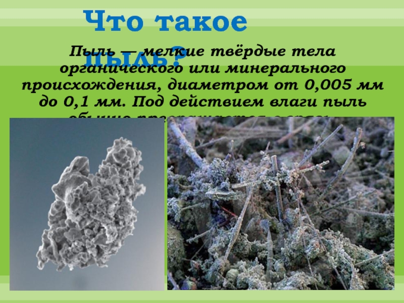 происхождения, диаметром от 0,005 мм до 0,1 мм. Под действием влаги пыль обычно превращается в грязь.