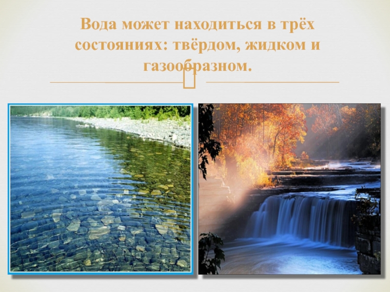 Слайд 4Вода может находиться в трёх состояниях: твёрдом, жидком и газообразном.