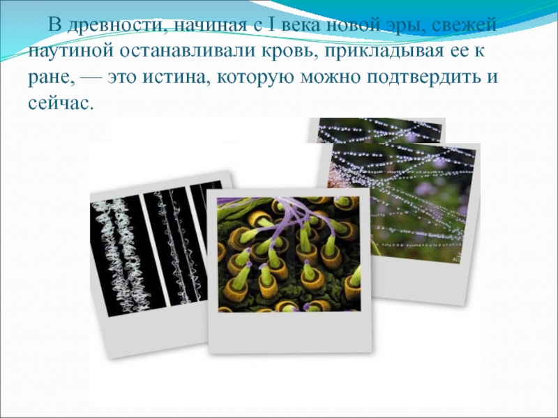 В древности, начиная с I века новой эры, свежей паутиной останавливали кровь, прикладывая ее к