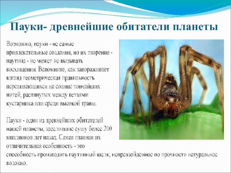 Слайд 3 Пауки- древнейшие обитатели планеты