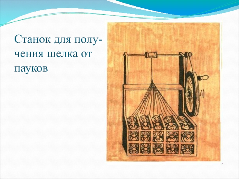 Слайд 20 Станок для полу- чения шелка от пауков