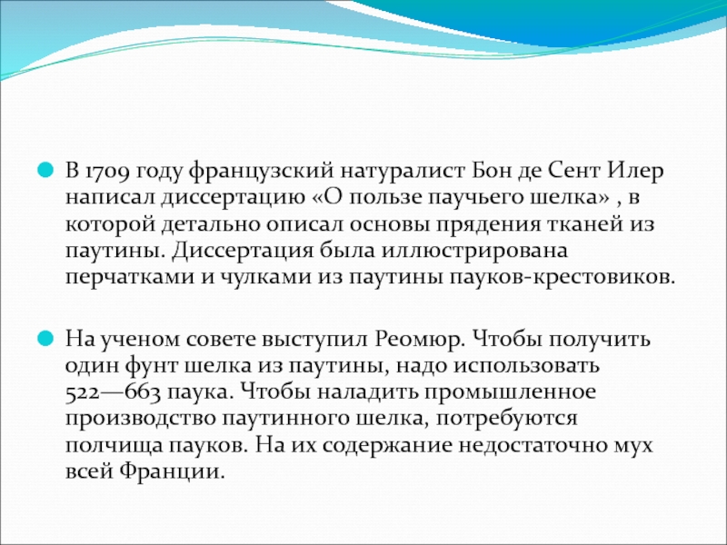 В 1709 году французский натуралист Бон де Сент Илер написал диссертацию «О пользе паучьего шелка» , в