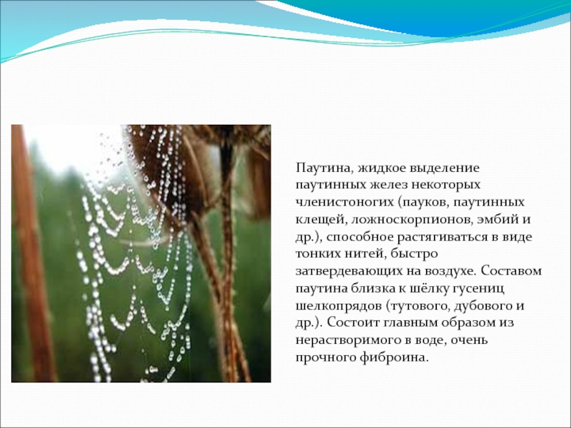 эмбий и др.), способное растягиваться в виде тонких нитей, быстро затвердевающих на воздухе. Составом паутина близка к шёлку гусениц шелкопрядов (тутового, дубового и др.). Состоит главным образом из нерастворимого в воде, очень прочного фиброина.