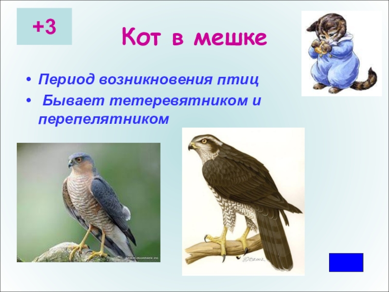 Кот в мешкеПериод возникновения птиц Бывает тетеревятником и перепелятником +3