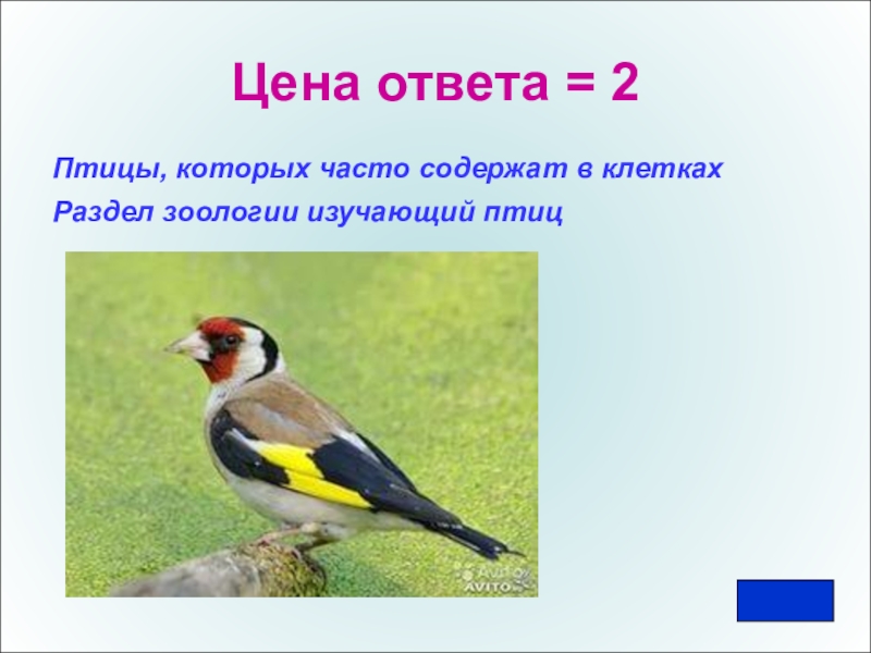 Цена ответа = 2Птицы, которых часто содержат в клеткахРаздел зоологии изучающий птиц