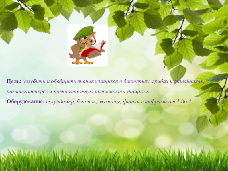 Слайд 3Цель: углубить и обобщить знания учащихся о бактериях, грибах и лишайниках,