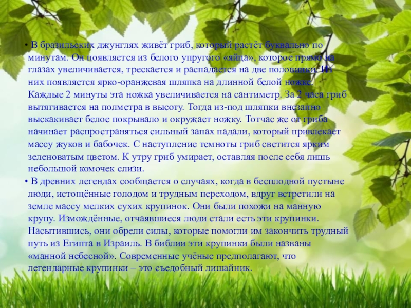 Слайд 10 В бразильских джунглях живёт гриб, который растёт буквально по минутам.
