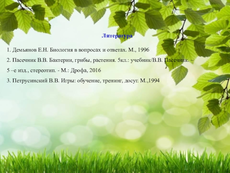 1. Демьянов Е.Н. Биология в вопросах и ответах. М., 1996