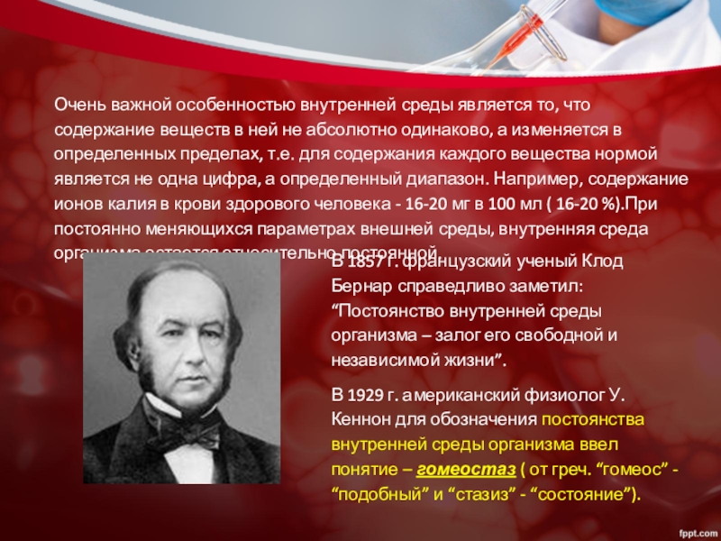В 1857 г. французский ученый Клод Бернар справедливо заметил: “Постоянство внутренней среды организма – залог его свободной и независимой жизни”.