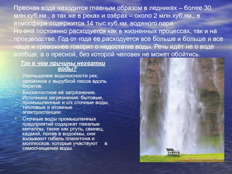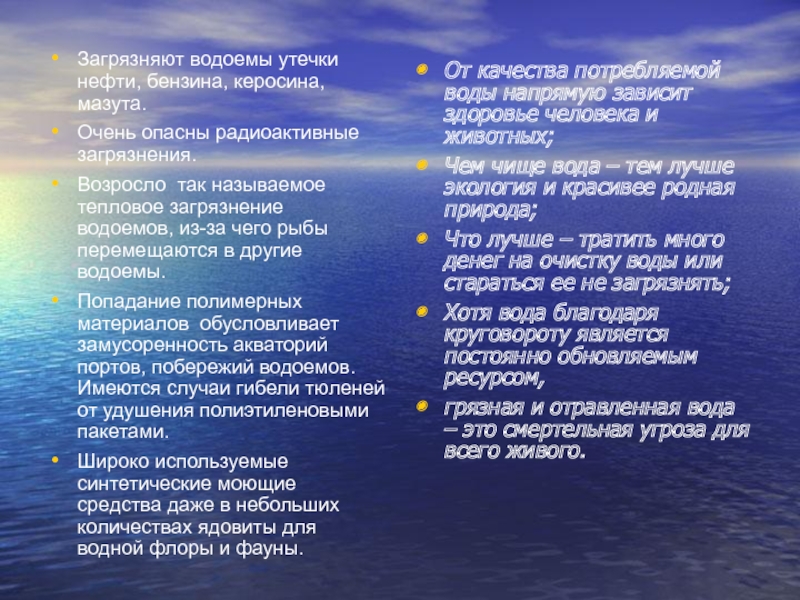 Безжалостное её загрязнение. Источники загрязнения: бытовые, промышленные и с/х сточные воды, тепловые и атомные электростанции.