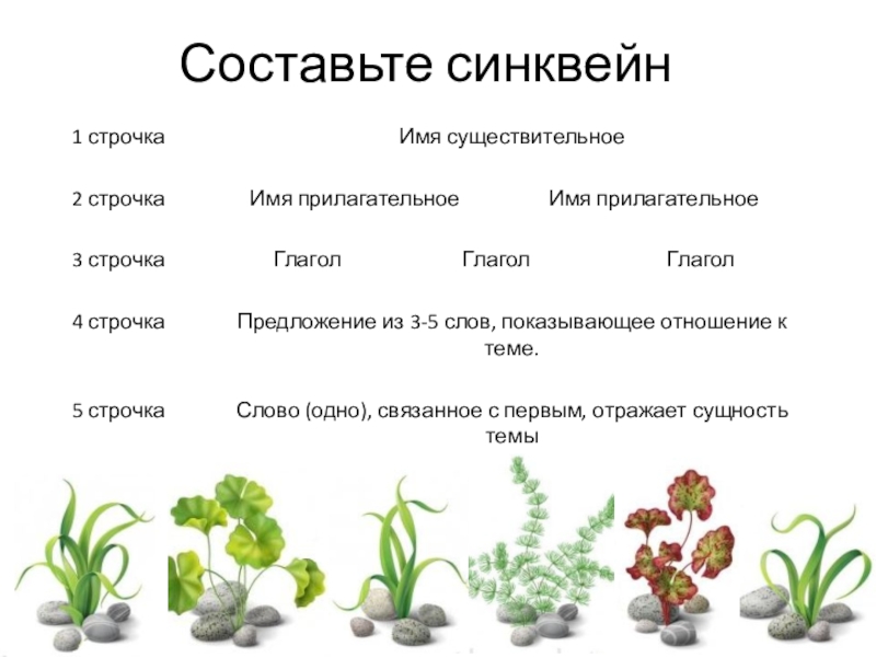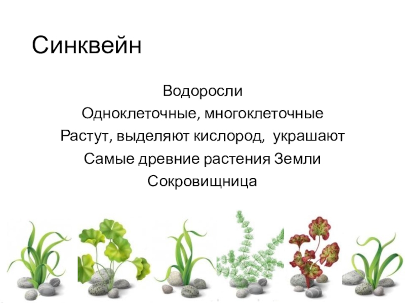 Синквейн ВодорослиОдноклеточные, многоклеточныеРастут, выделяют кислород, украшают Самые древние растения ЗемлиСокровищница
