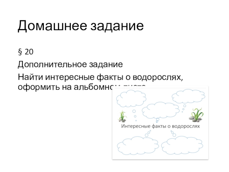 Домашнее задание§ 20Дополнительное задание Найти интересные факты о водорослях, оформить на альбомном листе.