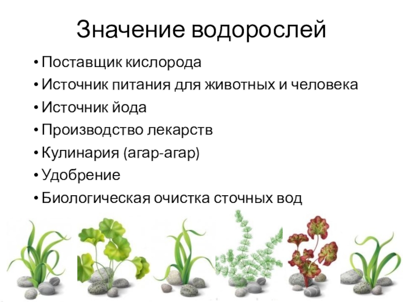 Значение водорослейПоставщик кислородаИсточник питания для животных и человекаИсточник йодаПроизводство лекарствКулинария (агар-агар)Удобрение Биологическая очистка сточных вод