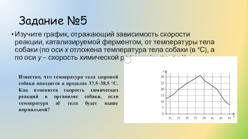 Задание №5Изучите график, отражающий зависимость скорости реакции, катализируемой ферментом, от температуры тела собаки (по оси х отложена