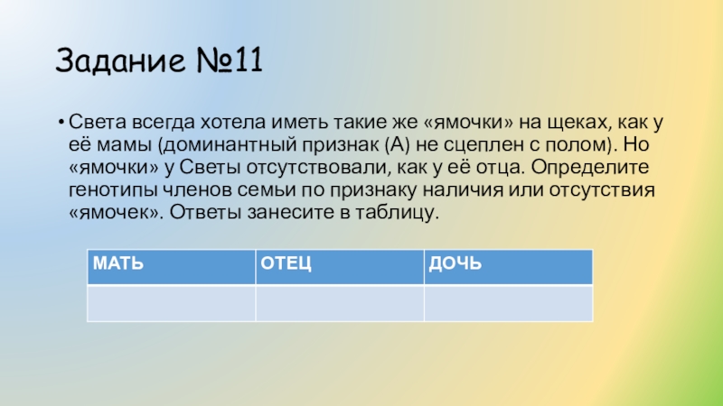 Задание №11Света всегда хотела иметь такие же «ямочки» на щеках, как у её мамы (доминантный признак (А)