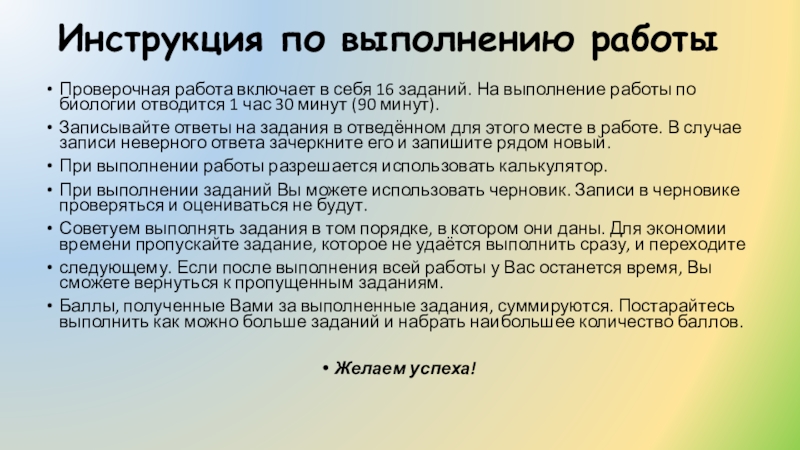 Инструкция по выполнению работыПроверочная работа включает в себя 16 заданий. На выполнение работы по биологии отводится 1