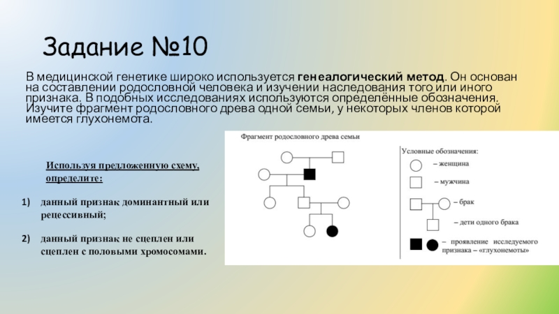 Задание №10В медицинской генетике широко используется генеалогический метод. Он основан на составлении родословной человека и изучении наследования