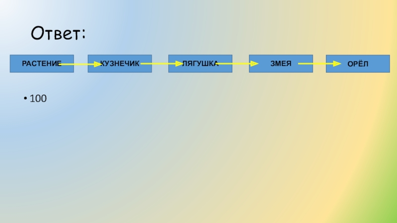 Ответ:100РАСТЕНИЕКУЗНЕЧИКЛЯГУШКАЗМЕЯОРЁЛ