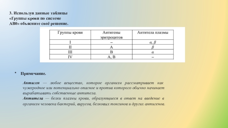 3. Используя данные таблицы «Группы крови по системе АВ0» объясните своё решение.Примечание. Антиген — любое вещество, которое организм