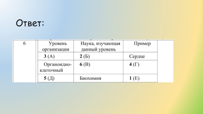 Задание №6Заполните пустые ячейки таблицы, используя приведённый ниже список пропущенных элементов: для каждого пропуска, обозначенного буквой, выберите