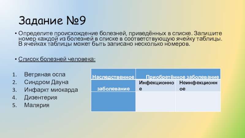 Задание №9Определите происхождение болезней, приведённых в списке. Запишите номер каждой из болезней в списке в соответствующую ячейку