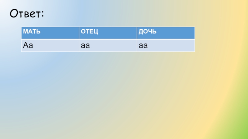 у её мамы (доминантный признак (А) не сцеплен с полом). Но «ямочки» у Светы отсутствовали, как у её отца. Определите генотипы членов семьи по признаку наличия или отсутствия «ямочек». Ответы занесите в таблицу.