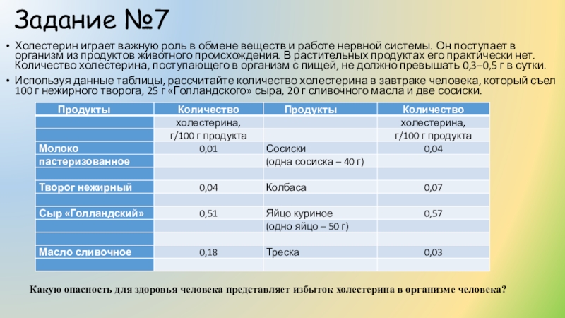 Задание №7Холестерин играет важную роль в обмене веществ и работе нервной системы. Он поступает в организм из