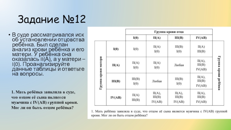 Задание №12В суде рассматривался иск об установлении отцовства ребёнка. Был сделан анализ крови ребёнка и его матери.