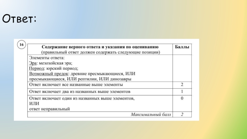 Используя фрагмент геохронологической таблицы, установите эру и период , в который обитал данный организм, а также его возможного предка уровня класса (надотряда) животных.