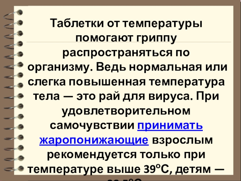 Слайд 8Таблетки от температуры помогают гриппу распространяться по организму. Ведь нормальная или слегка