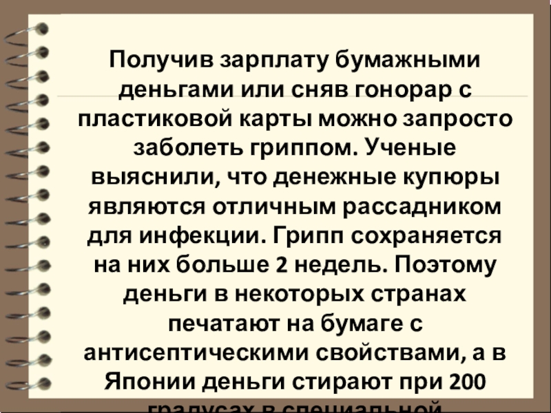 запросто заболеть гриппом. Ученые выяснили, что денежные купюры являются отличным рассадником для инфекции. Грипп сохраняется на них больше 2 недель. Поэтому деньги в некоторых странах печатают на бумаге с антисептическими свойствами, а в Японии деньги стирают при 200 градусах в специальной стиральной машине.