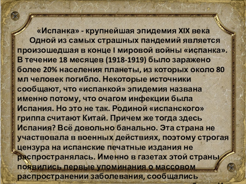 Слайд 6«Испанка» - крупнейшая эпидемия XIX века