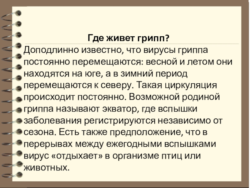 летом они находятся на юге, а в зимний период перемещаются к северу. Такая циркуляция происходит постоянно. Возможной родиной гриппа называют экватор, где вспышки заболевания регистрируются независимо от сезона. Есть также предположение, что в перерывах между ежегодными вспышками вирус «отдыхает» в организме птиц или животных.