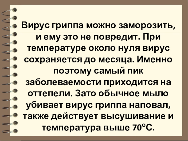 Слайд 10Вирус гриппа можно заморозить, и ему это не повредит. При температуре около
