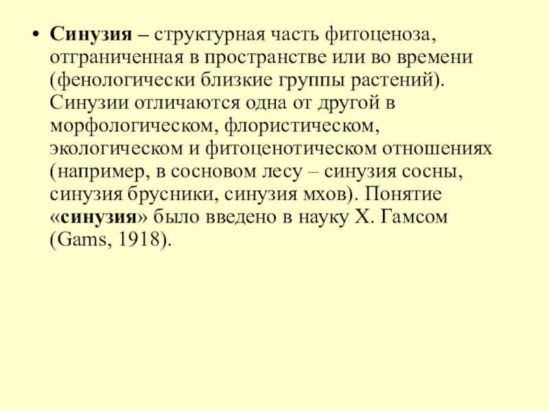 близкие группы растений). Синузии отличаются одна от другой в морфологическом, флористическом, экологическом и фитоценотическом отношениях (например, в сосновом лесу – синузия сосны, синузия брусники, синузия мхов). Понятие «синузия» было введено в науку X. Гамсом (Gams, 1918).